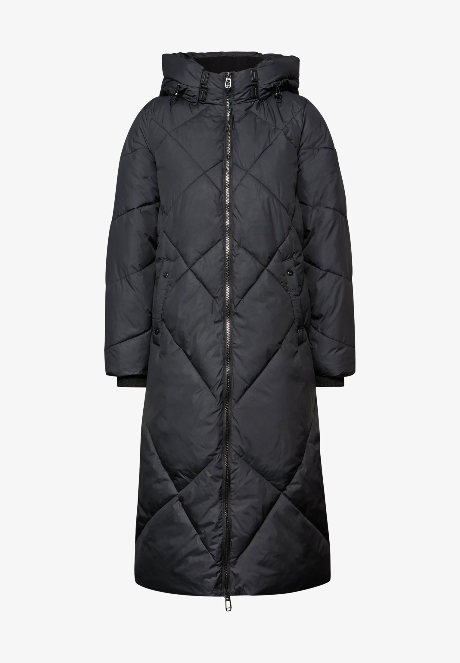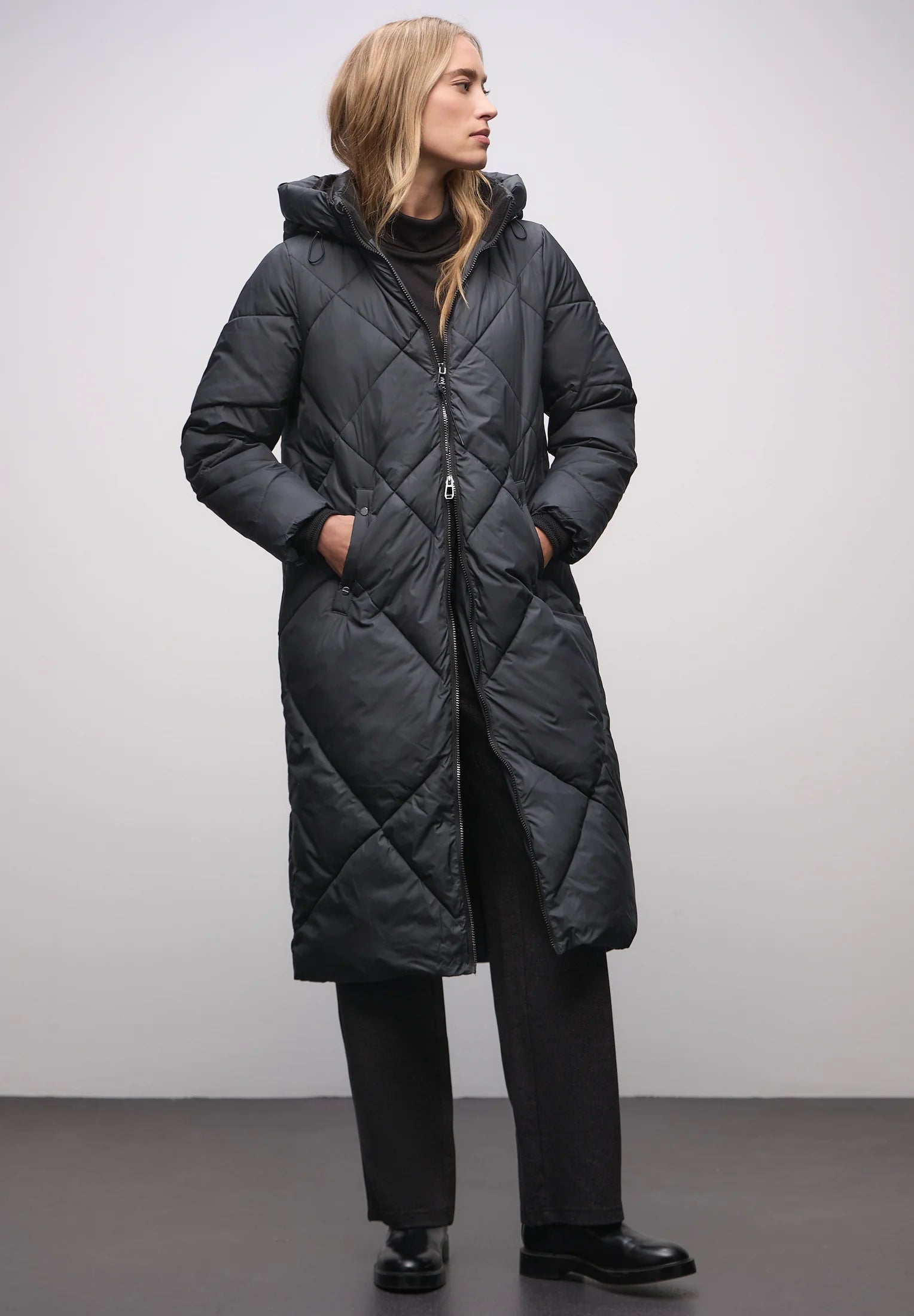 Täckkappa med avtagbar huva och två-vägsdragkedja. Rygglängd: 110cm.