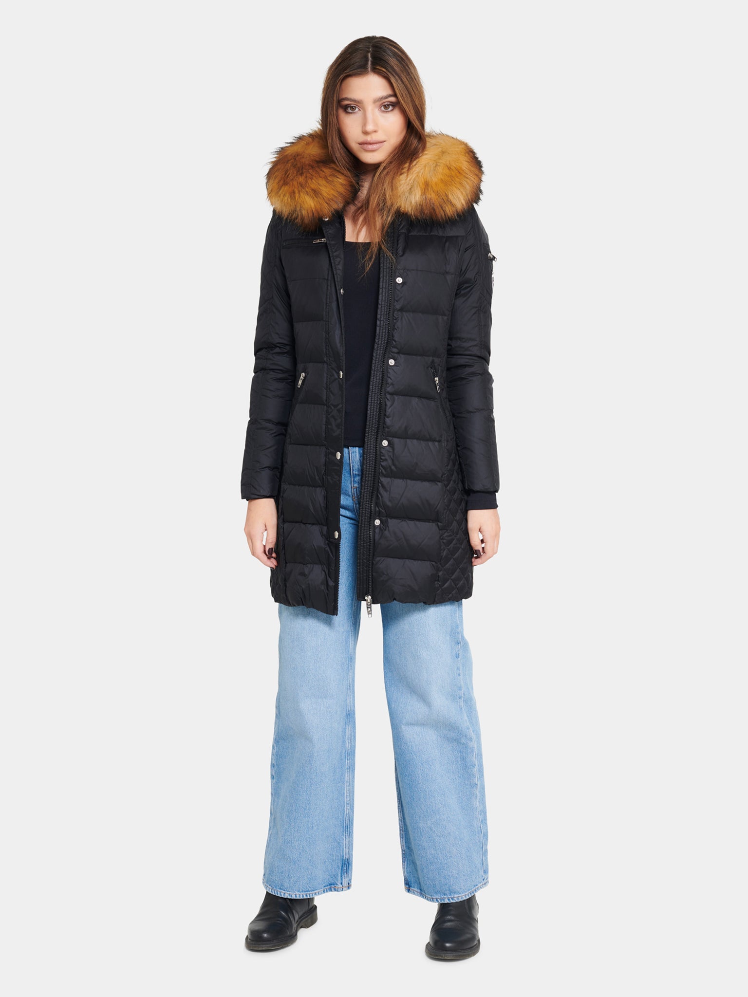 Längre dunjacka i smalare passform. Rygglängd: 90cm.