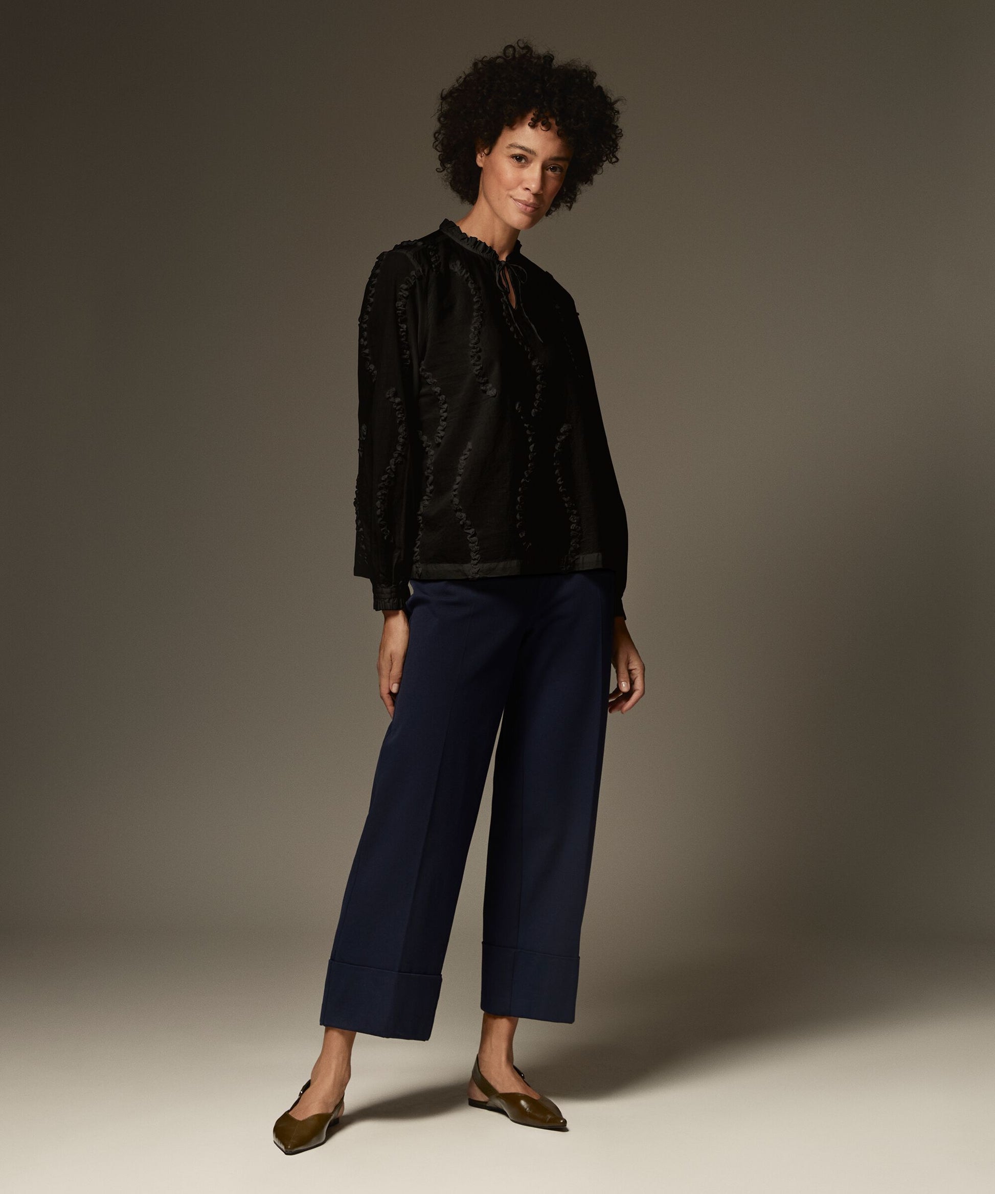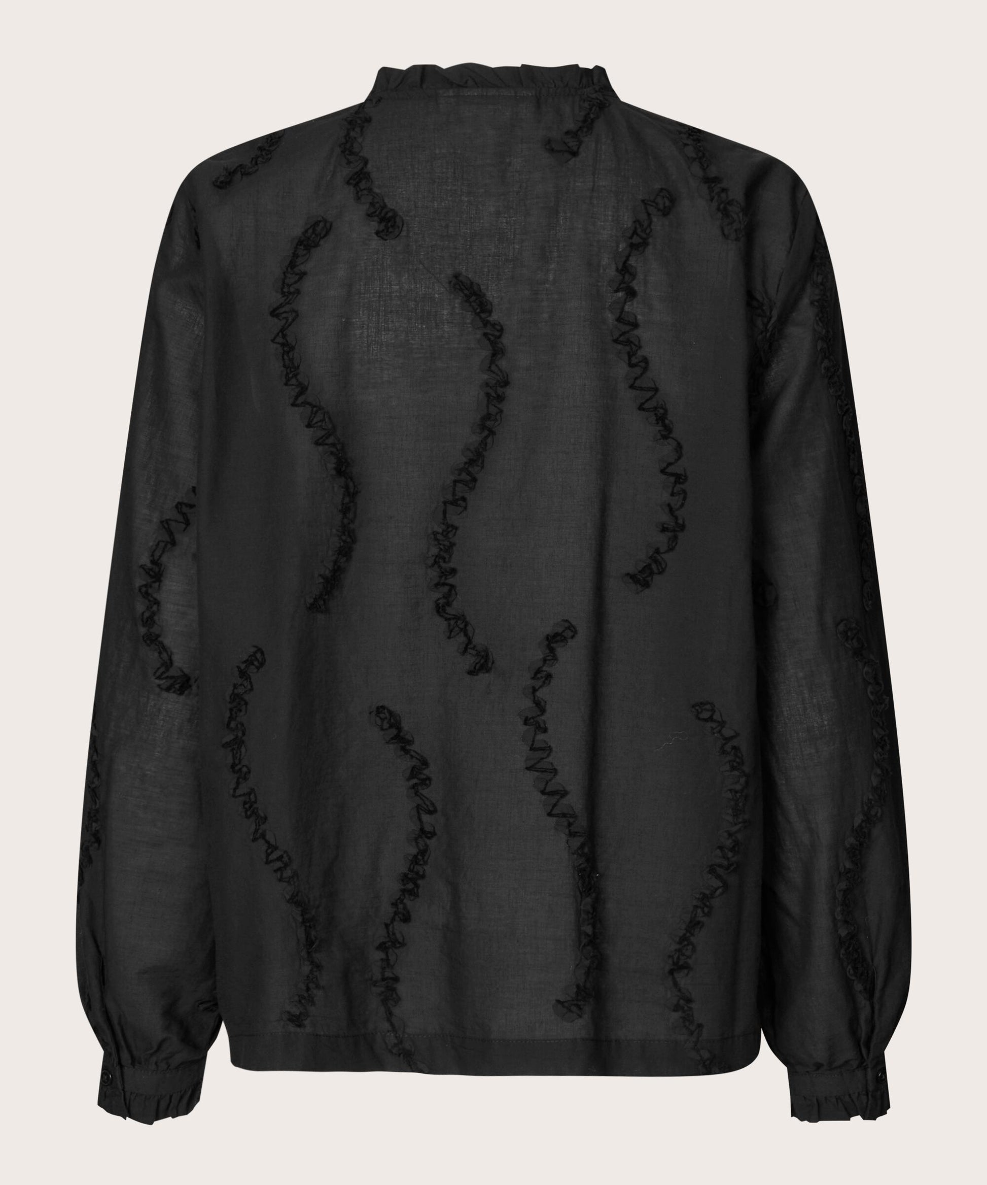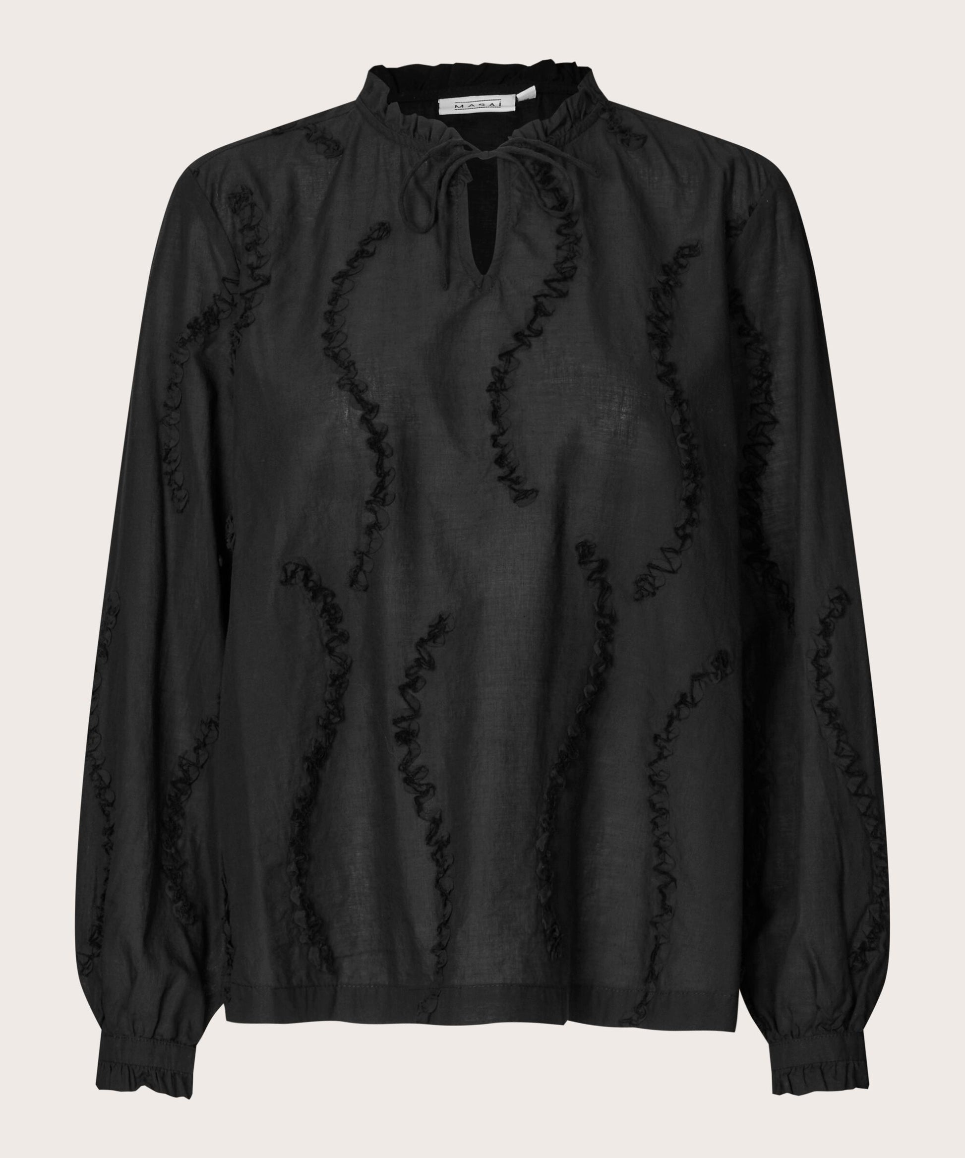 Den här toppen får dig direkt att känna dig feminin och välklädd. Den mjuka, lätt tunna bomullen skapar en elegant look, och toppen är designad med ett knytband i halsen och massor av fina detaljer som ger en unik textur. Den klassiska skärningen ger generös komfort och får toppen att falla mjukt och behagligt. Styla den med dina favoritbyxor eller kjol för en avslappnad feminin look. Modellen är 176 cm lång och bär storlek M.