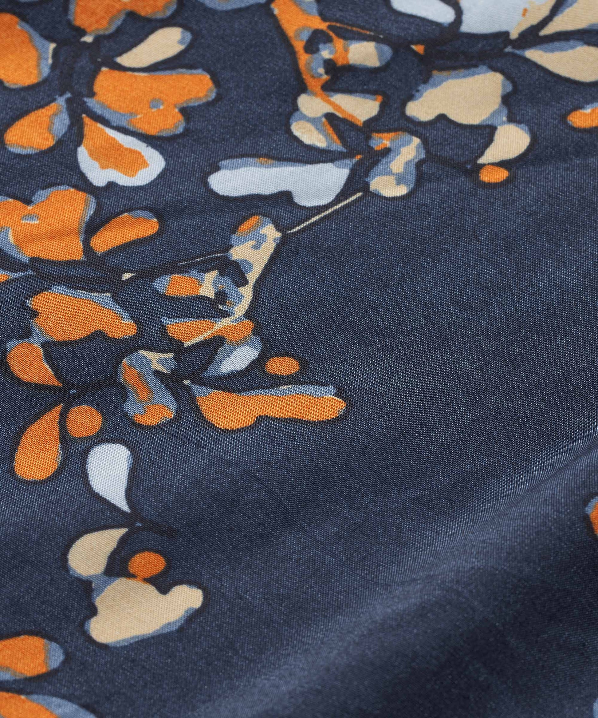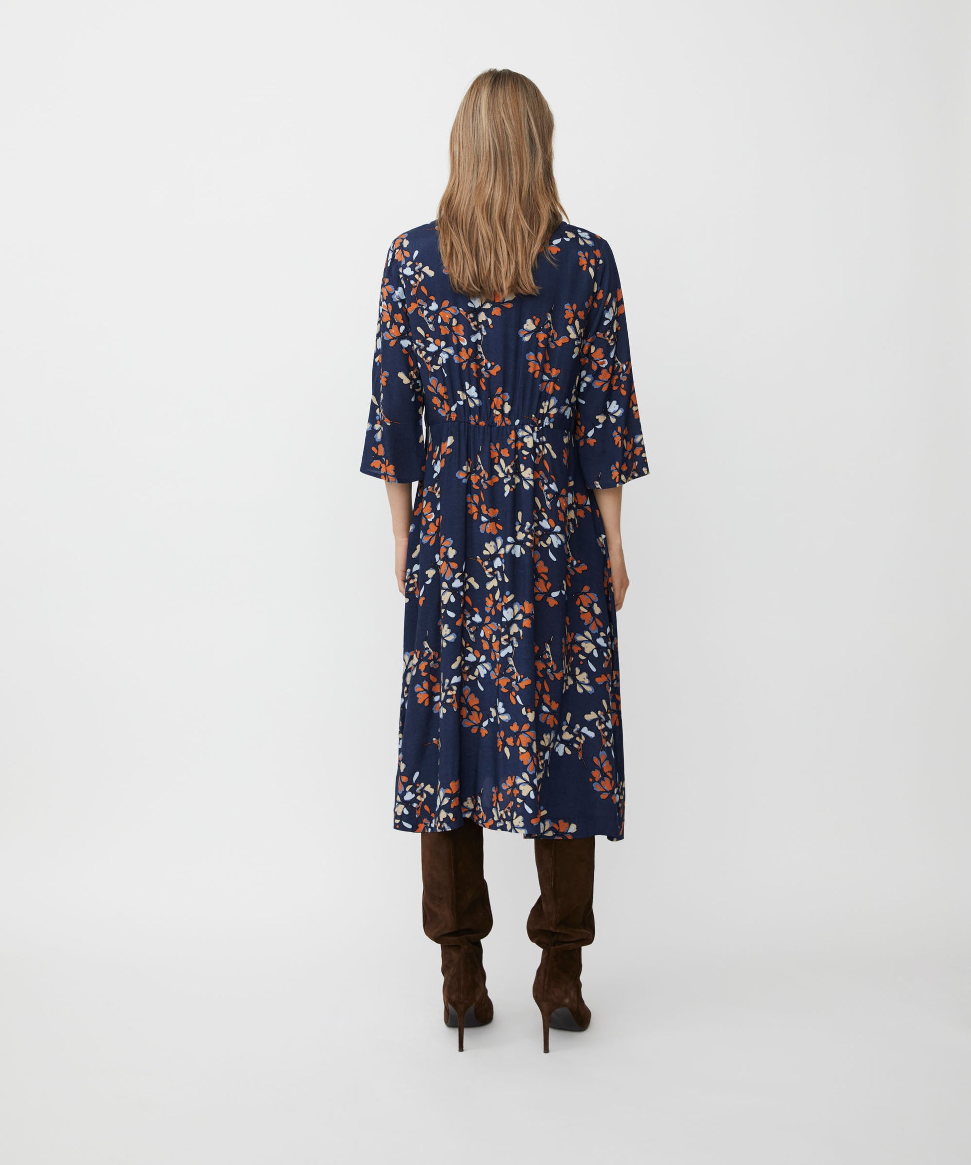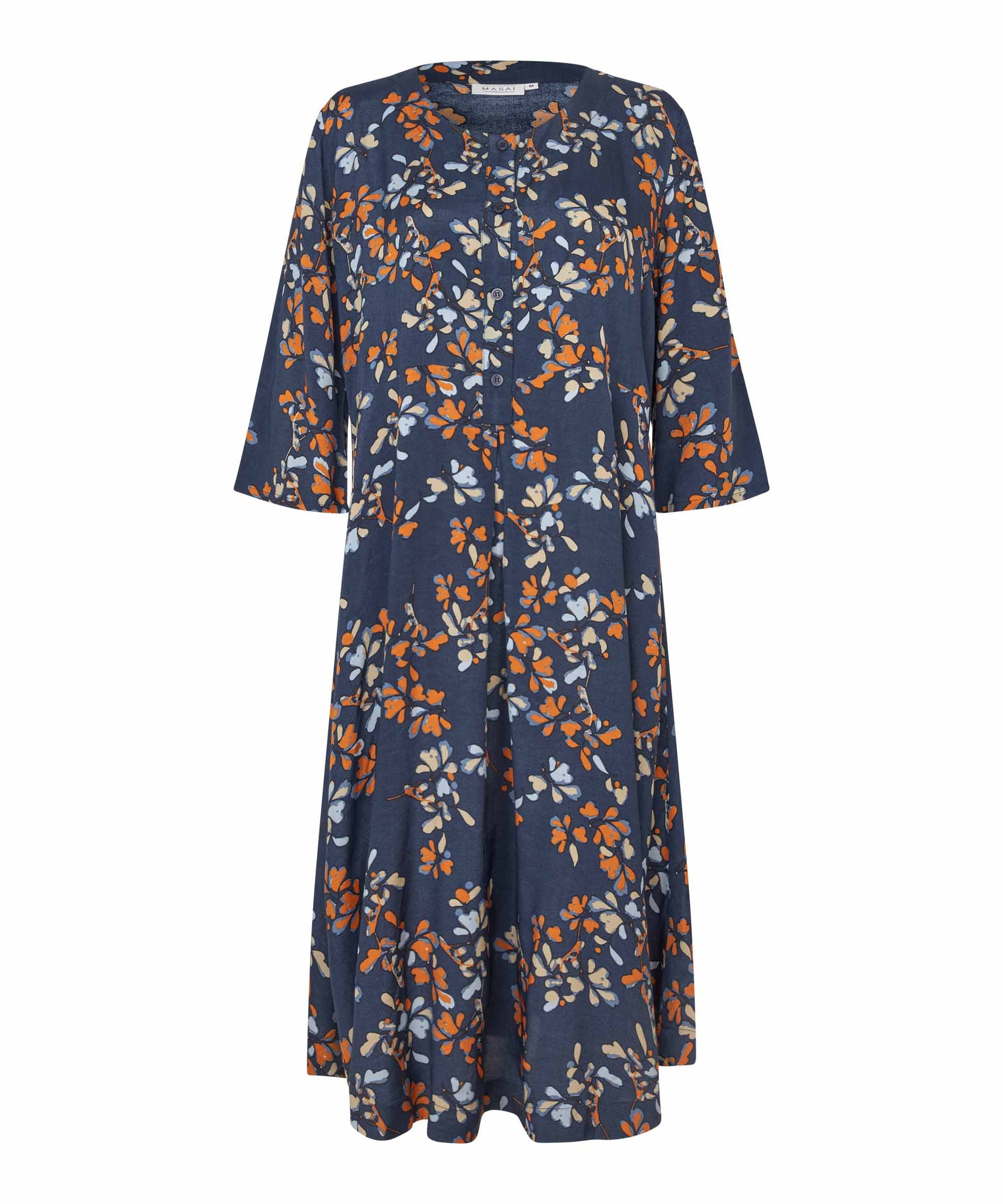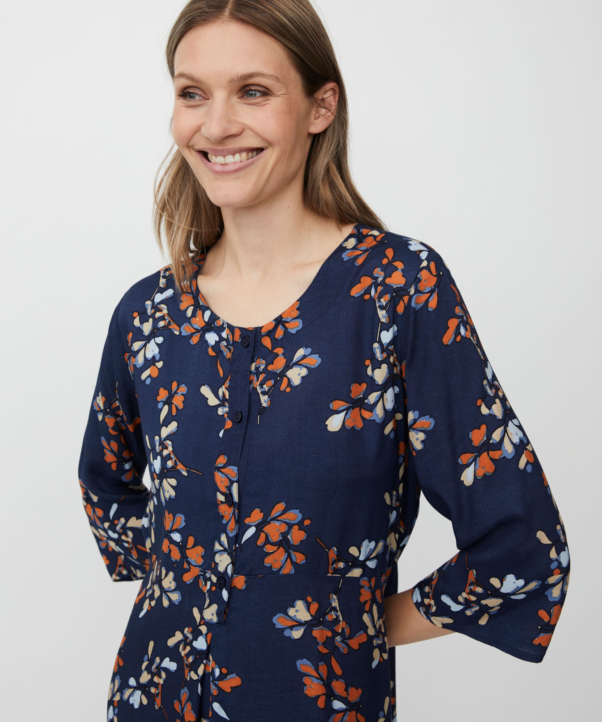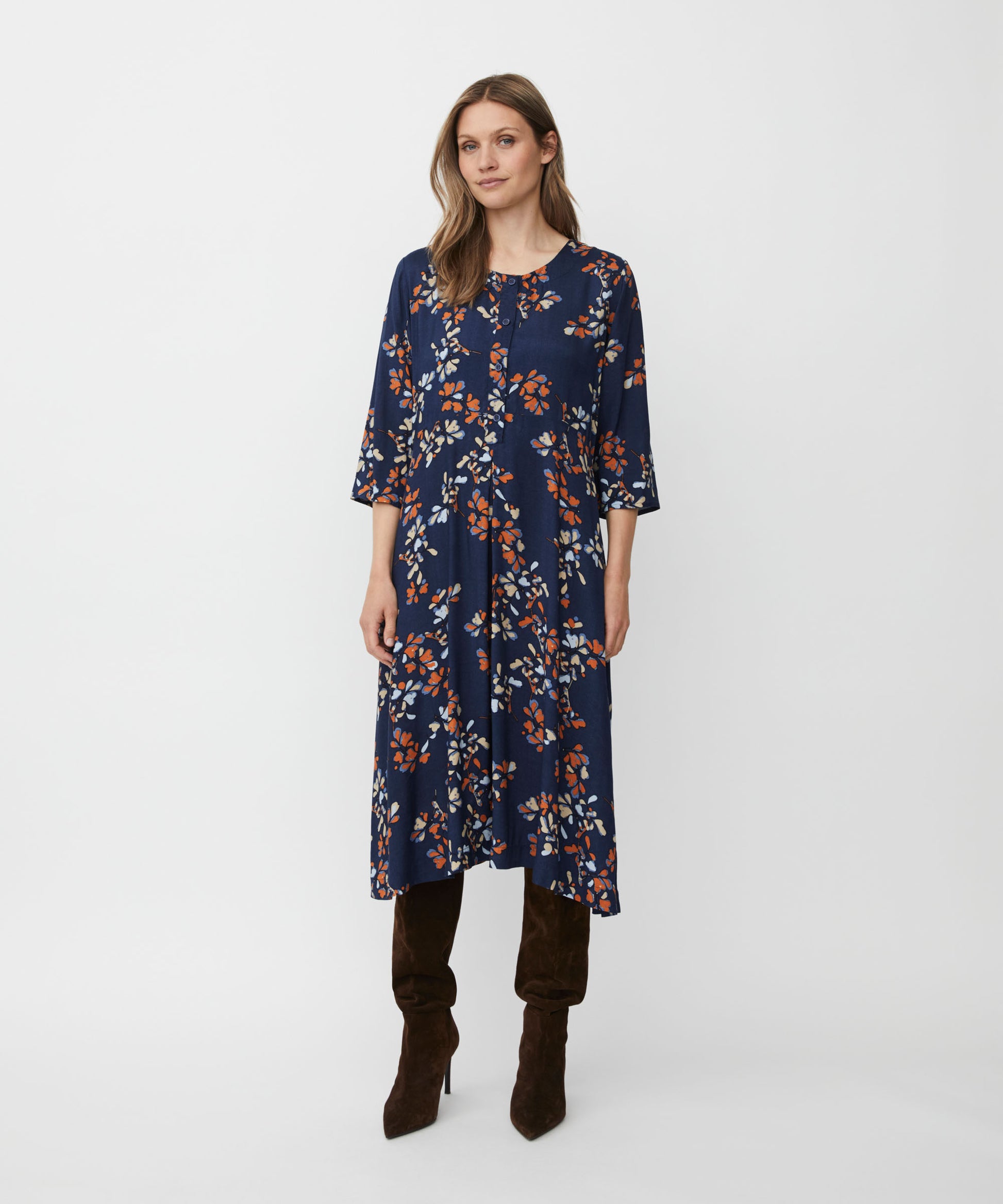 Denna blommiga klänning är din genväg till en feminin och personlig look. De orange blommorna skapar en fin kontrast till det mörkblå. Klänningen är designad med trekvartslång ärm, knappar framtill och mjuk resår i midjan. Modellen är 176 cm lång och bär storlek M.