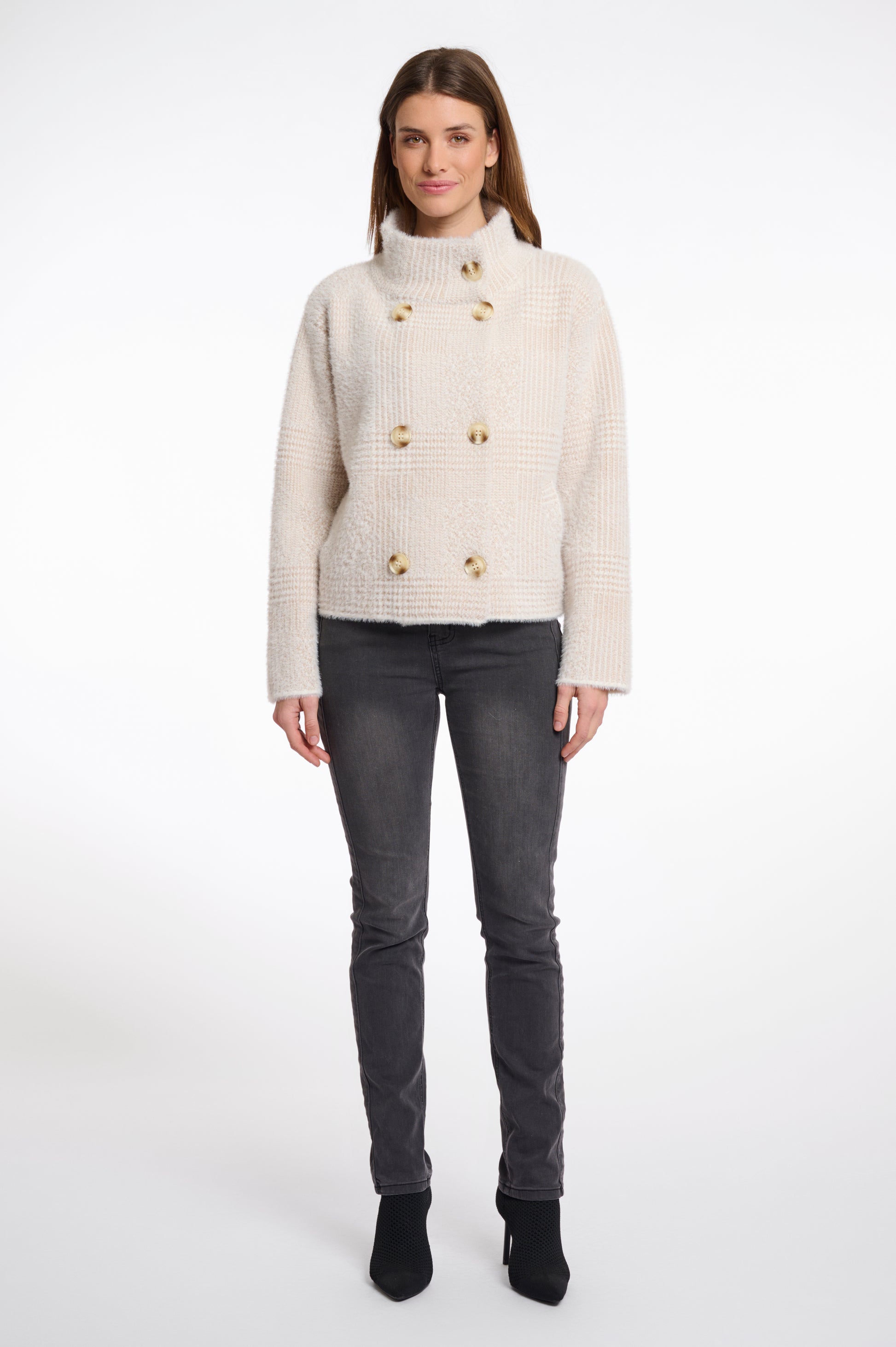Kort dubbelknäppt kofta tillverkad av vår berömda mjuka stickning. Denna mysiga kofta har en lös passform, ståkrage, stora knappar och stickade fickor. Perfekt för att komplettera vilken look som helst!