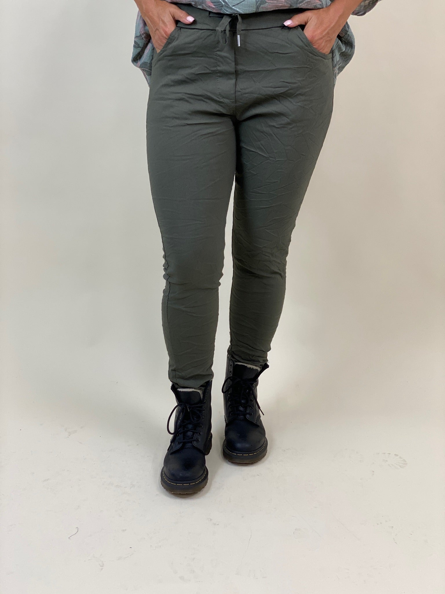 Magiskt stretchiga byxor med resår i midjan och fickor fram och bak.