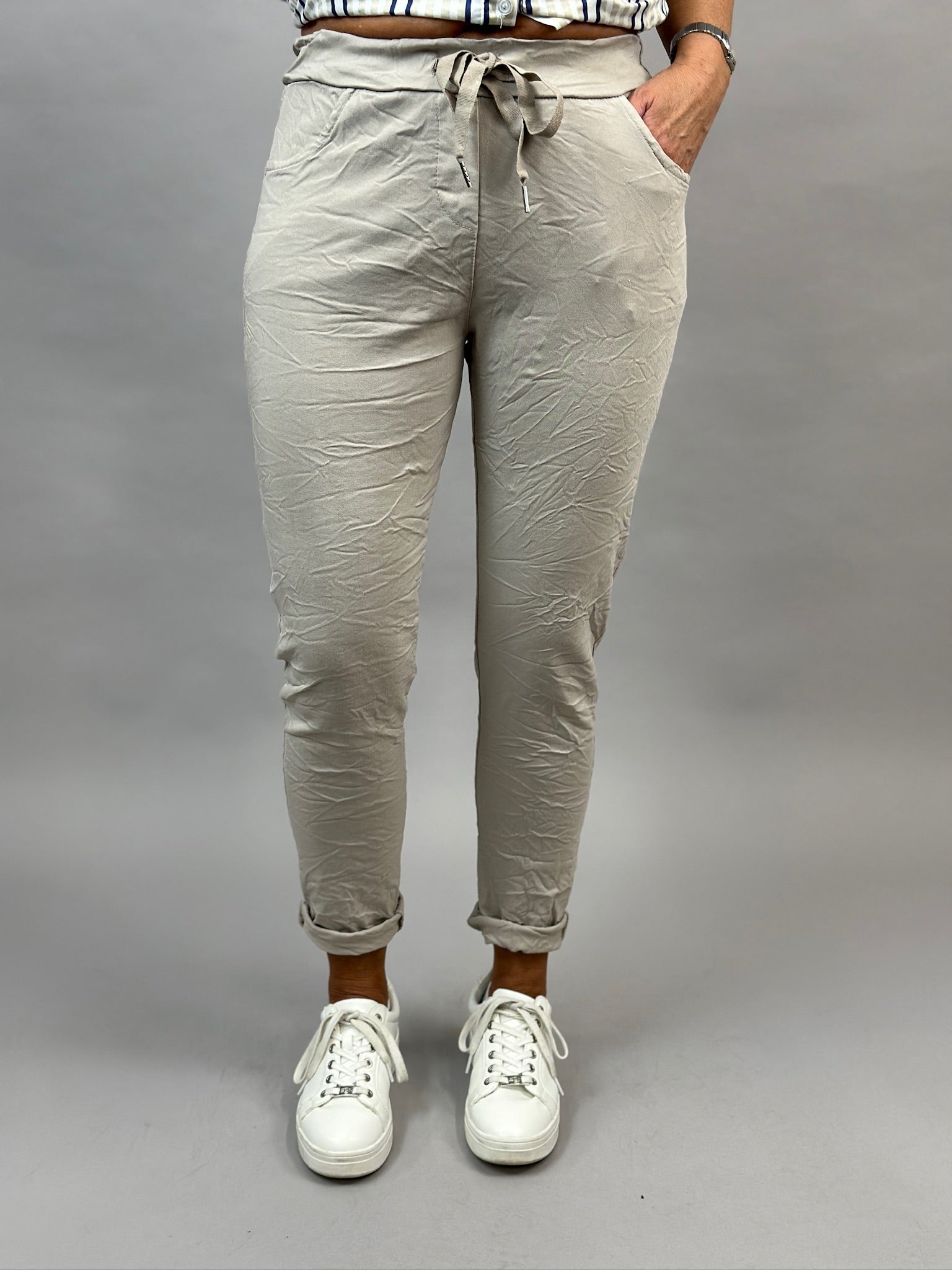 Magiskt stretchiga byxor med resår i midjan och fickor fram och bak.