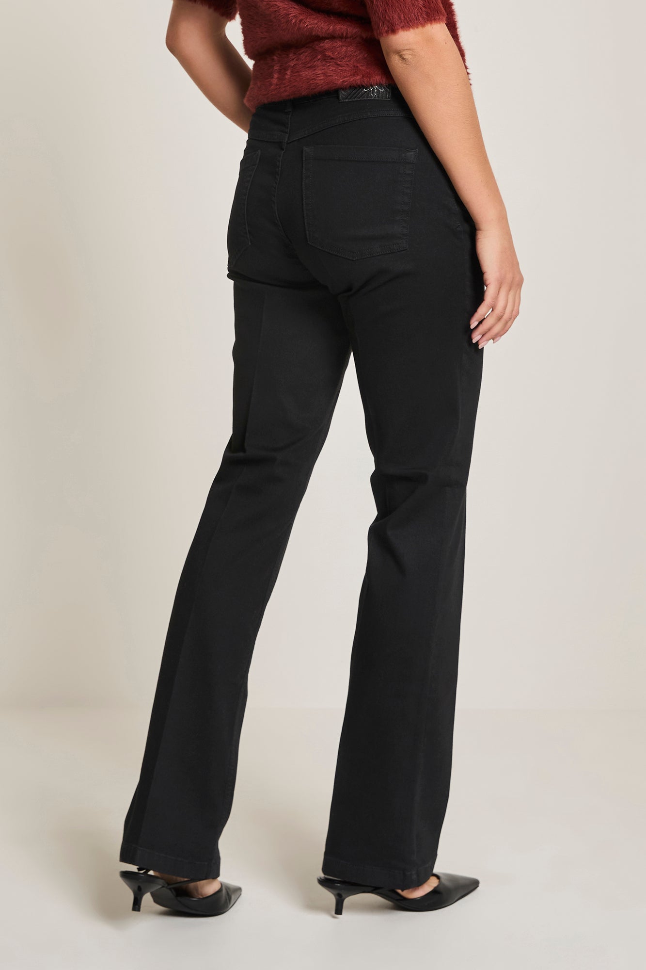 Jeans med hög midja och raka ben. Svarta strasstenar på framfickorna.